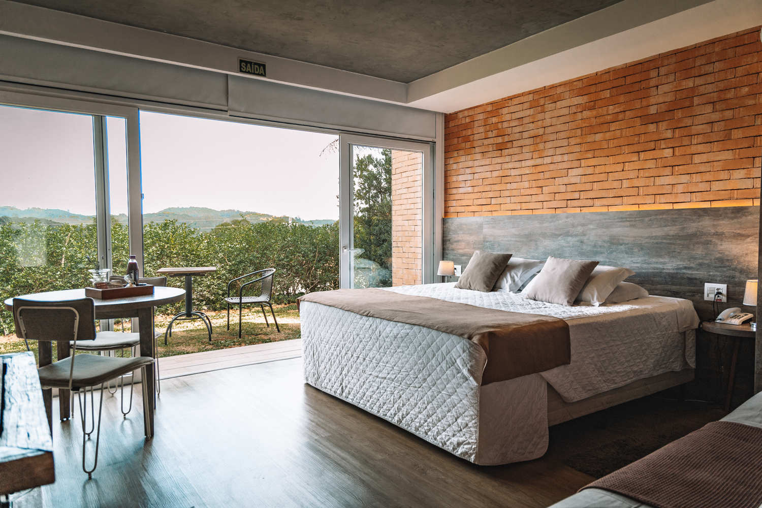 DetalhesOs tijolos de demolição que eram considerados resíduos, aqui, foram utilizados como revestimento do nosso primeiro bangalô, contrastando com o mobiliário contempor&ac