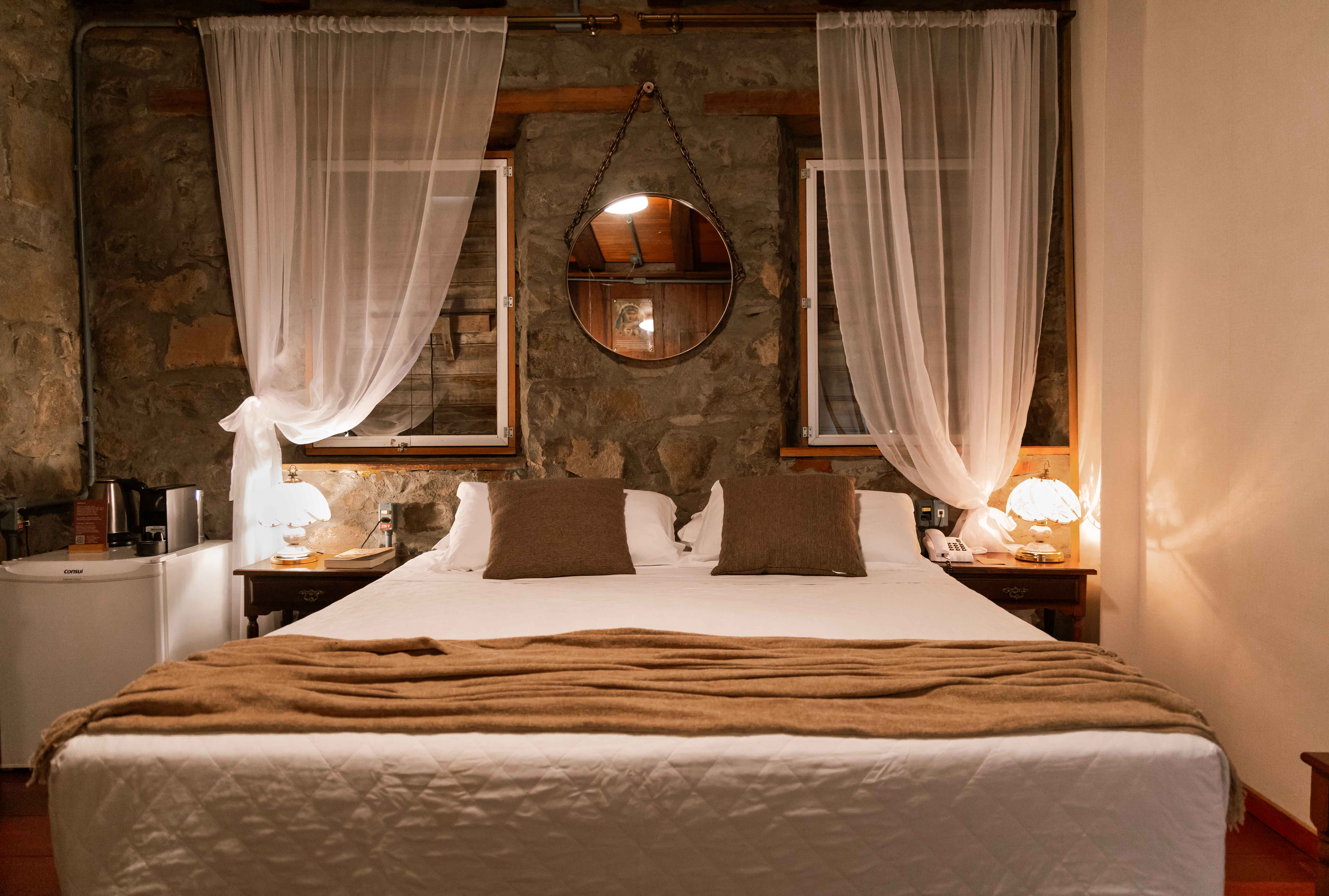 Este cômodo possui uma grande parede de pedras, ainda da época de 1878, que nos causa um encanto pela sua beleza e imponência, proporcionando uma experiência única de s